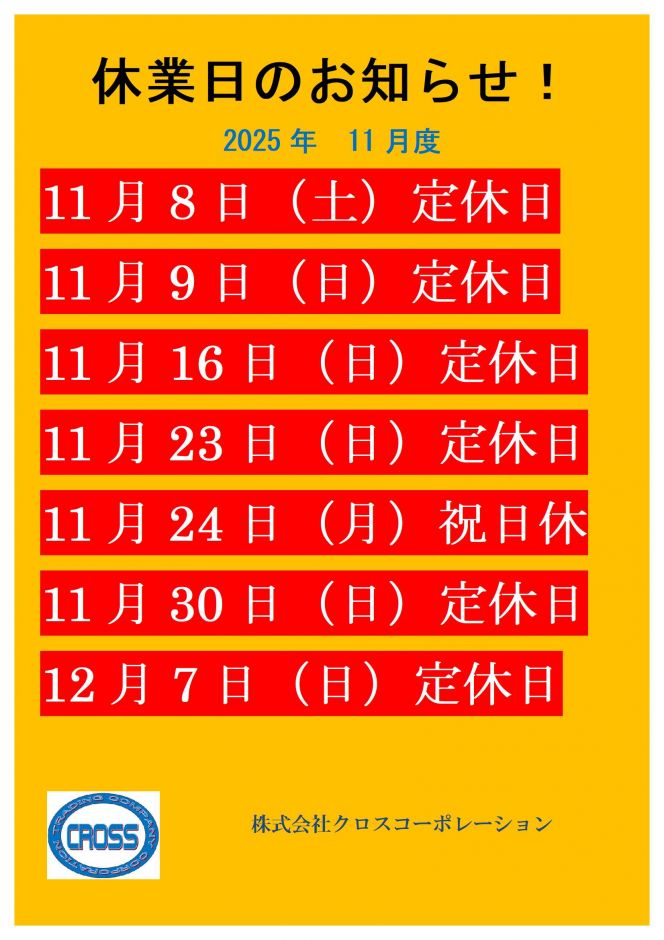 2025年度11月の休業日のお知らせ!